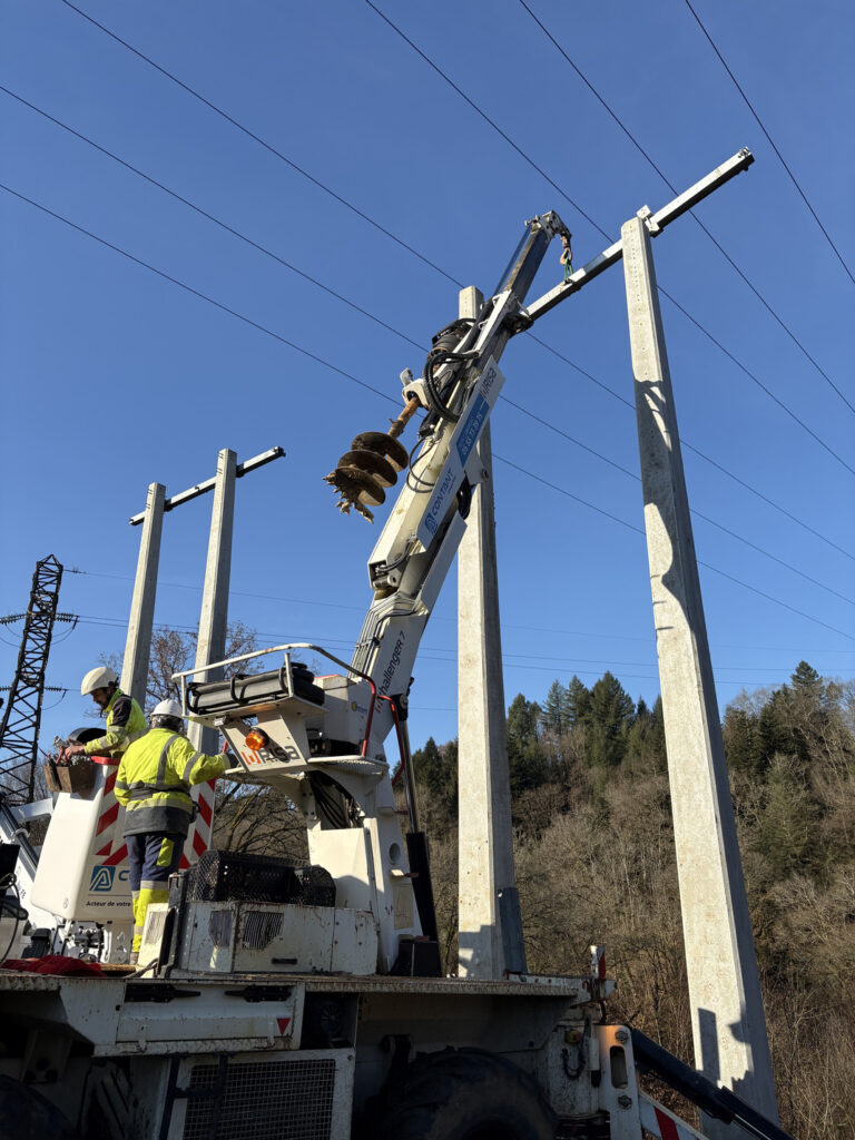 Le chantier de remplacement des lignes HTA en sortie du Poste Source de Bradascou est en cours à Uzerche, en…
