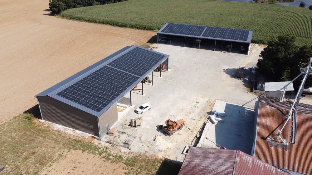 Dans le cadre du développement des infrastructures industrielles durables, ALLEZ Energies – Rochefort (Service Photovoltaïque) a réalisé la construction de deux hangars de stockage agricole, intégrant des panneaux photovoltaïques en toiture. Ces installations combinent des espaces de stockage fonctionnels et une production d’énergie renouvelable, contribuant à l’autonomie énergétique des exploitations et à la transition vers des solutions plus durables.