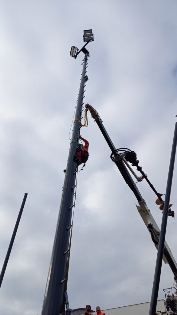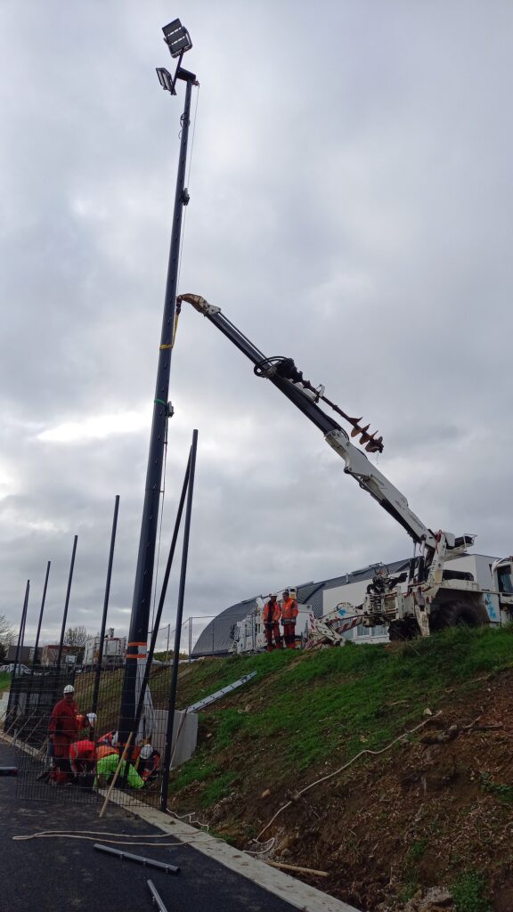 Nos équipes ont assuré la mise en place de 1,7 km de câbles pour alimenter 6 nouveaux poteaux d’éclairage de 18 à 21 mètres de hauteur, offrant un éclairage performant et uniforme pour les terrains.