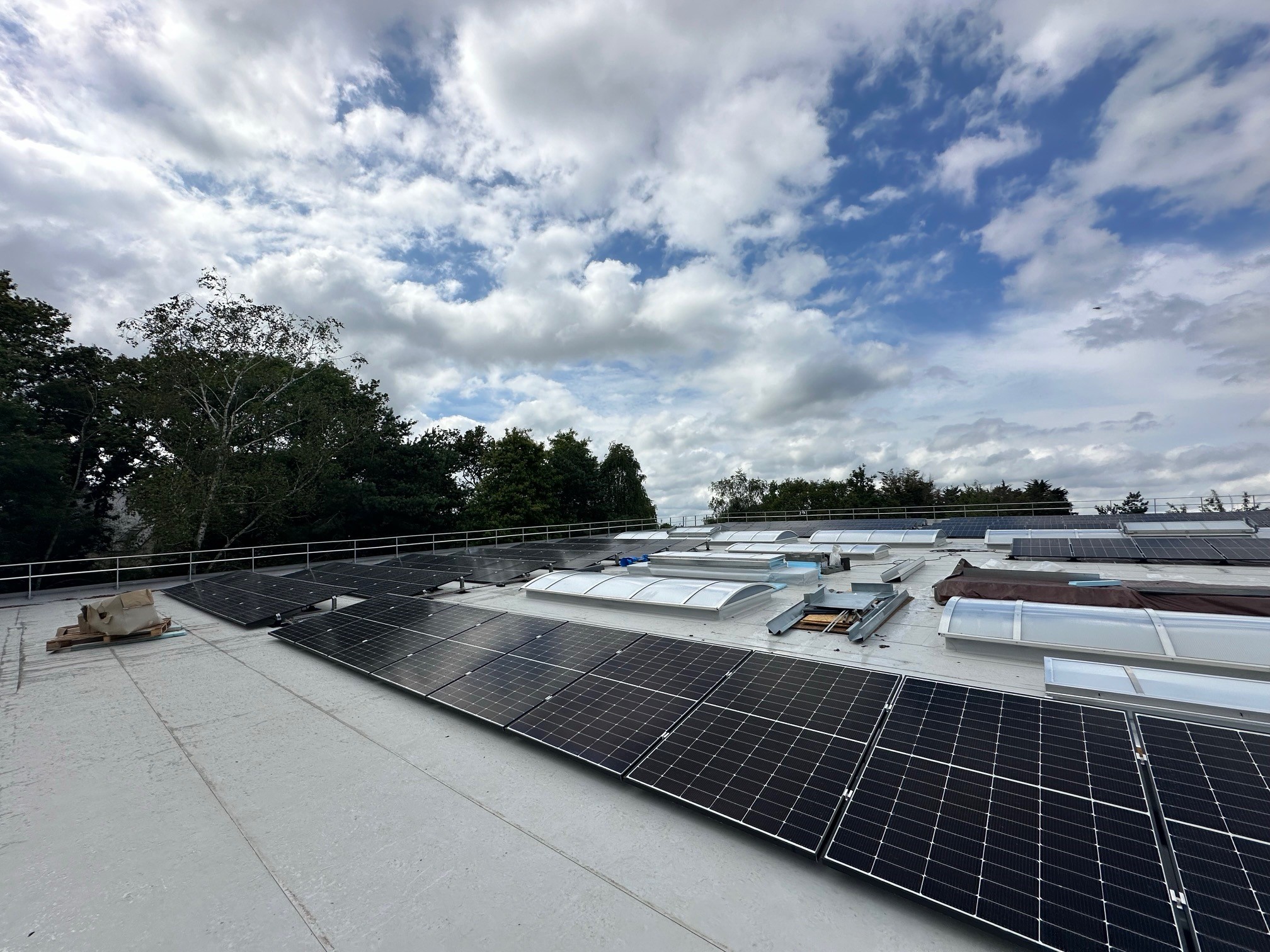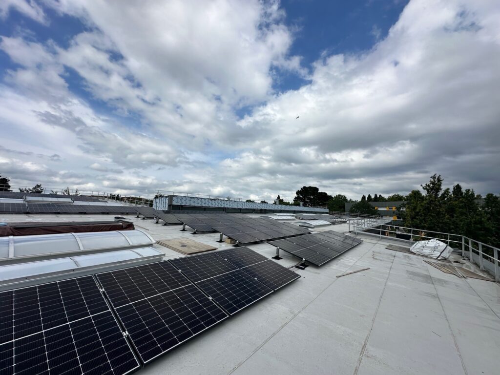 Les travaux ont porté en premier lieu sur les courants forts, avec l’installation des modules photovoltaïques, leur raccordement aux onduleurs, puis l’intégration de la production électrique au réseau du bâtiment. Les équipes ont assuré la mise en conformité des tableaux électriques, la protection des circuits (sectionnement, parafoudre, dispositifs de coupure) ainsi que le raccordement en respectant les normes en vigueur. Cette installation permet une production d’énergie renouvelable destinée à l’autoconsommation du site, contribuant à la réduction de son empreinte énergétique.