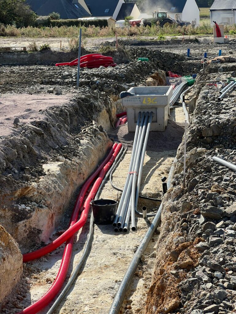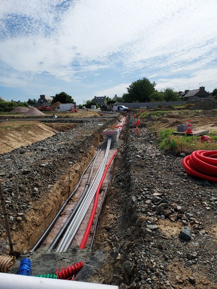 Nos équipes sont intervenues pour le raccordement d’un lotissement de 38 lots, comprenant l’ensemble des réseaux souples : basse tension (BT), télécommunications, adduction d’eau potable (AEP) et éclairage public (EP).